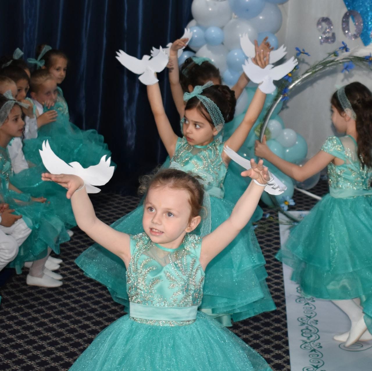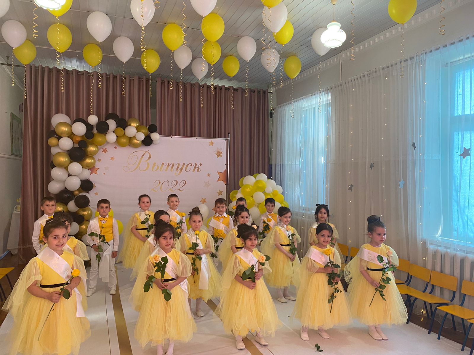 Мальчики группы «Светлячки» были одеты в классическом стиле - белая рубашка, и желтого цвета безрукавка и бабочка, а девочки – в желтые платья. Зажигательные танцы «До-Ре-Ми» и «Рок-н-рол» с первых аккордов сопровождались аплодисментами зрителей. Преодолев все препятствия, ребята получили в награду подарки и дипломы выпускников. В завершении праздника дети и взрослые выпустили в небо воздушные шары и белых голубей. Наши дети попрощались с детским садом и готовятся к новому жизненному этапу – поступлению в школу. Позади остались дни, наполненные увлекательными путешествиями в мир непознанных, неразгаданных, удивительных открытий.