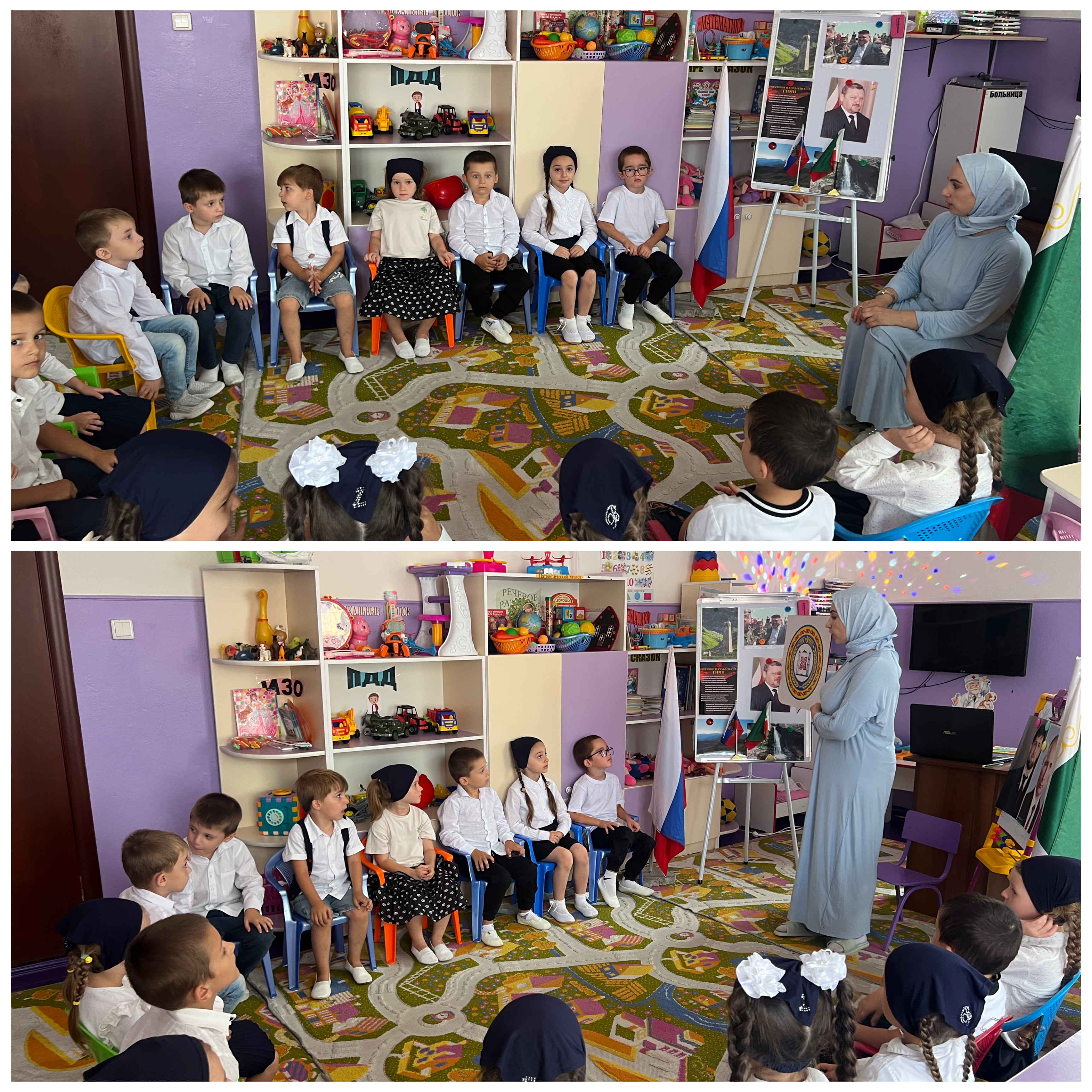 В связи с этим, 23.08.24г. в средней группе «Ласточки» прошел открытый урок памяти Первого Президента Чеченской Республики Героя России А-Х.А. Кадырова. Воспитатель рассказала историю Героя, про вклад в наше с вами будущее. Также в ДОУ были проведены беседы во всех возрастных группах. В ходе беседы обсудили роль Первого Президента ЧР в установлении мира и благополучия на территории региона, в укреплении государственности и целостности страны. В старшей группе «Кузнечики» провели мероприятие посвященное памяти А-Х.А. Кадырова. Дети с интересом слушали биографию нашего великого героя из уст Курбановой М.С. Она рассказала какие значимые для нашей республики шаги предпринял Кадыров А-Х. После таких бесед воспитанники с гордостью и почтением прочитали стихи.